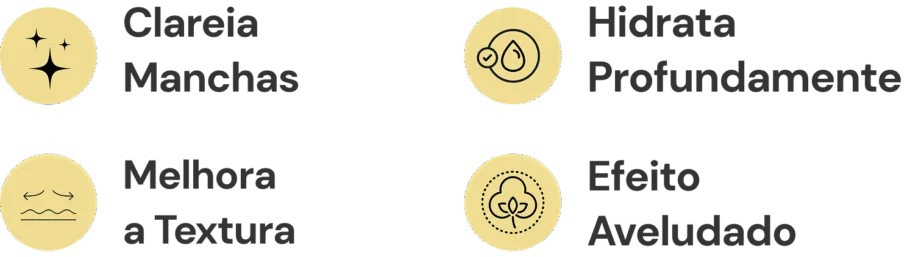 Fornece um efeito aveludado para sua pele, graças a ingredientes como a Vitamina E, que ajuda a suavizar e deixar sua pele com efeito aveludado.